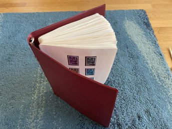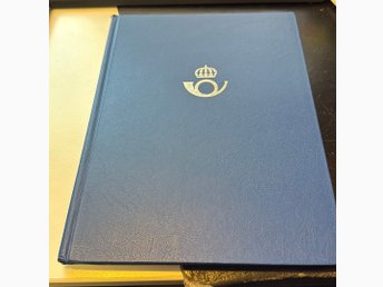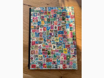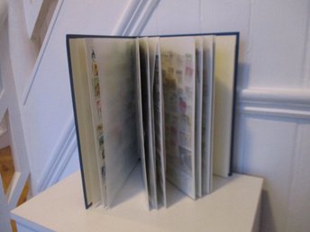 Ett blått frimärksalbum fullt med frimärken i olika utföranden / olika länder