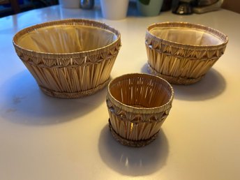 Set med 3 vintage flätade blomkrukor med plastfoder