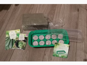 Drivhus med kokosbriketter, gratis till fröer till zucchini och sallat