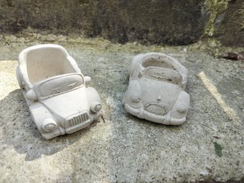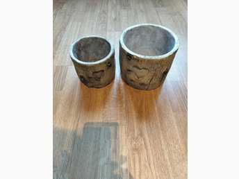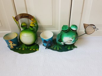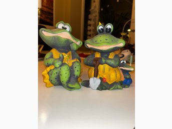 Två dekorativ grodor med kruka en har hov den andra har välkomst skylt