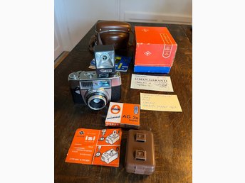 Kamera Optima 1A, väska, blixtaggregat, lampor, inf papper 1967.