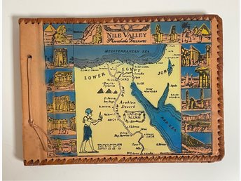 Gammalt fotoalbum i skinn med motiv från Egypten