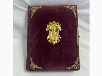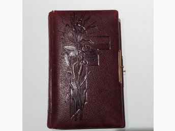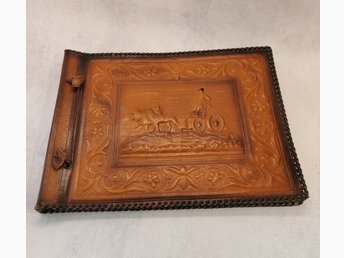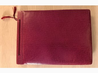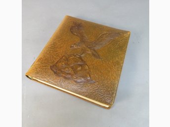 Äldre fotoalbum med läderomslag, präglad örn på klippa på framsidan