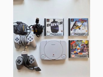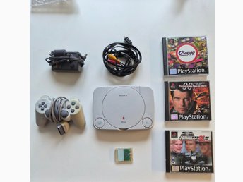 PS1 med handkontroll, spel och minneskort
