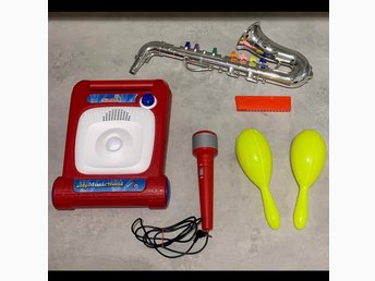 Musikinstrument set, microfon batteridriv., saxofon, munspel, marcas. Bra skick!