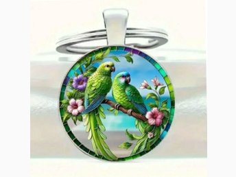 1 st silverfärgad Nyckelring med två gröna papegojor och rosa hibiskus blommor!