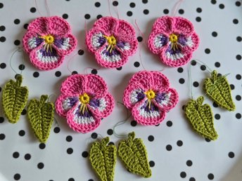 Inredning, midsommar, 5 virkade penséer / violer och 6 löv, merc bomullsgarn.