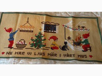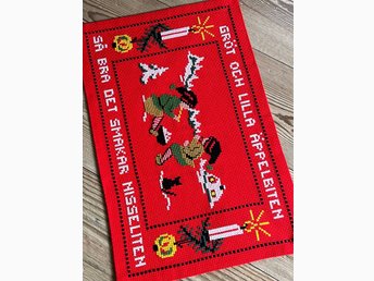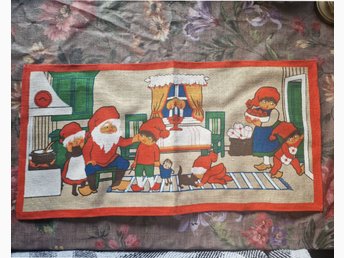 Färgglad väggbonad med budskap/Nissar äter gröt/Som NY.