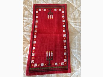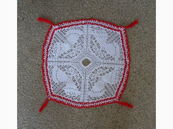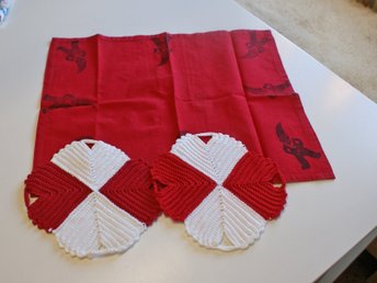Jul 2 st virkade grytlappar i rött och vitt och en röd duk med tomtar