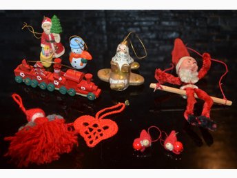 9 Julgranshängen julgranspynt olika material, äldre o nyare, Klicka upp bilden!