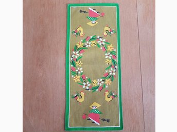 retro signerad påskduk bordslöpare i bomull påskkärringar vårblommor kycklingar