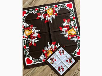 Två bomullsdukar med julmotiv/Tomtar/Hjärtan/Jul.