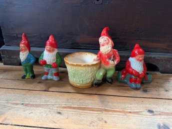Tomtar i keramik, 4 stycken och en kruka