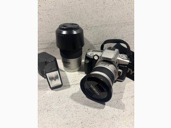 Minolta Dynax 4 analog systemkamera med objektiv och blixt