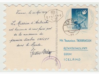 Österrike kort till island stpl. första dagen 1949 Bildandet av UNICEF