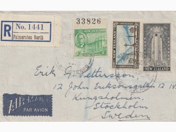 Flygpostbrev Rek från New Zealand Stpl 15//7 - 1946 sänt till Sverige