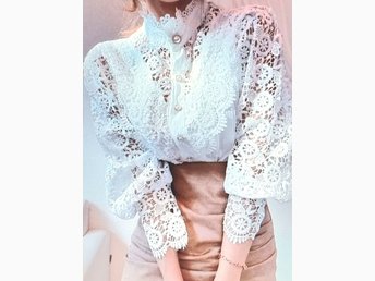 VIT SPETSBLUS I ROMANTISK STIL MED STÅKRAGE & PÄRLKNAPPAR BRÖLLOP M L 40 42 NY