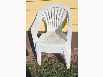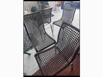 4 stapelbara plaststolar, bord, paraplybas
