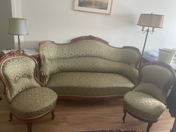 Vacker soffa med 2 Emma fåtöljer i grönt. Fina trä sniderier.