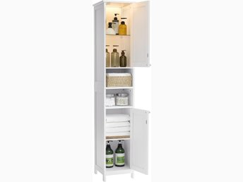 Högt och smalt badrumsskåp med justerbara hyllor, modern, molnvit BBC566W03