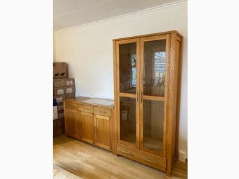 Massivt matbord, vitrinskåp, byrå, skänk, hylla i oljad ek från Mio