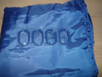Mörkblått duschdraperi med 12 ringar för upphängning. Mått: 180 cm x 200 cm