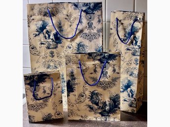 4 blå bärkassar/present påsar i papper med romantiska motiv