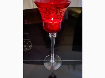 Röd ljusstake i glas på hög fot