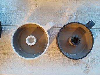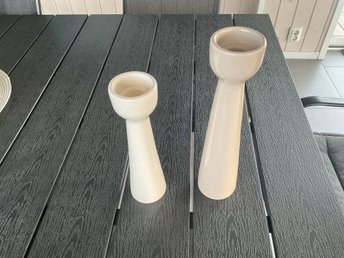 Två ljusstakar av keramik i olika färg och höjd,mörkbeige 26 cm,ljusbeige 21 cm