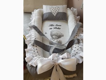 FINT Babynest i grå färg, handtag, täcke och kudde, hemsytt