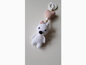 Virkat barnvagnshänge med björn och hjärta. Nytt