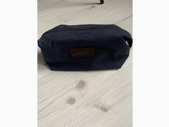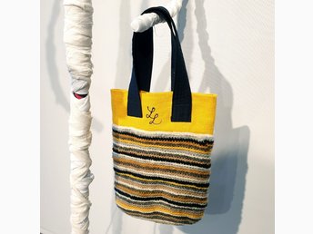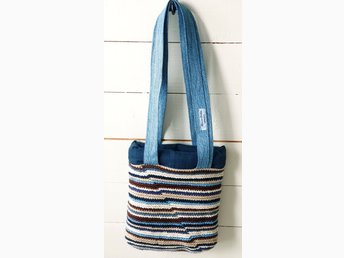 Virkad, kasse med matchande tygdelar i marinblått och jeans