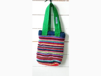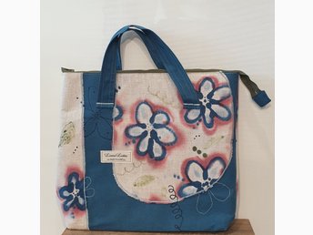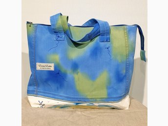 Turkos/grön/gul väska, fodrad med handmålat linne, Linnelotta