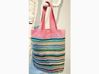 Virkad, kasse med matchande tygdelar i rosa och multifärgad