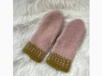 Rosa mönstrade ullvantar/handstickade o tovade varma tumvantar i fina färger