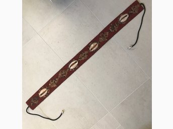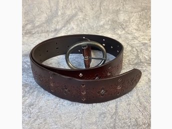 Läderbälte av äkta läder med 70-talsmotiv i fint skick. Längd 98cm