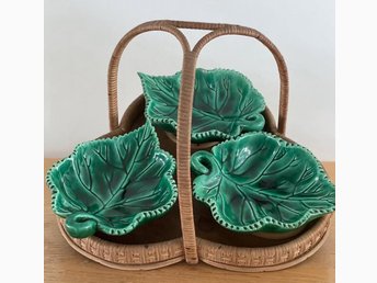 Set med 3 lövformade skålar i korg av rotting