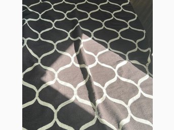 Oanvänd matta i mönstrat grått och beige med frans