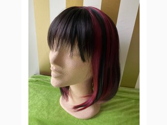 NY! Läcker svart peruk med röda slingor, inkl perukstock, maskerad, Halloween