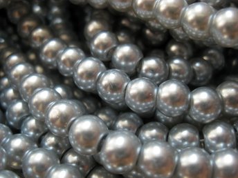 En sträng (ca 140 pärlor) glaspärlor pärlemorskimrande silvergrå 6 mm