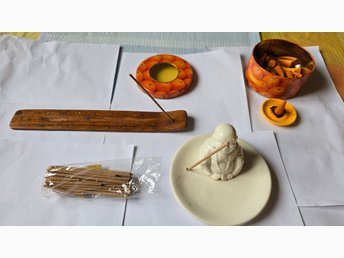 2 st rökelsehållare och ett litet fat för rökelsekoner