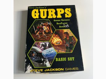 SJG rpg GURPS BASIC SET First Edition (1986), komplett låda med alla tillbehör