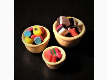 Miniatyr 3 skålar med handgjort godis tittskåp dockskåp dockhus 1:12