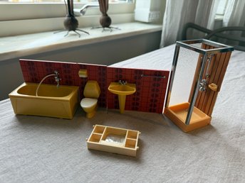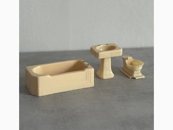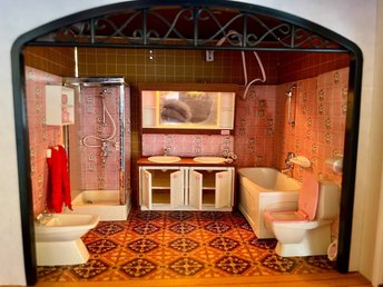 Lundby retro badrum: Belyst kommod, bide, badkar, dusch, toastol till dockskåp.