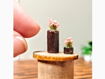 Set två pyttesmå vaser med plantor i mörkt trä, Lundby skalan