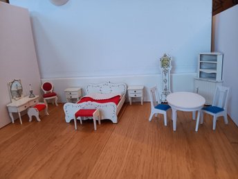 Vit sängmöbel och sittmöbel dockskåp Lundby 1:18