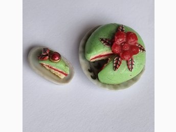 Grön Prinsesstårta + tårtbit på porslinsfat Dockskåp Miniatyr tårta ros Lundby