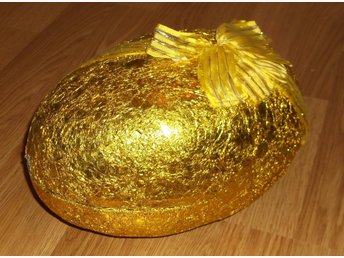 STORT Påskägg papper med Guld Gul metallfolie och gul rosett 1976 Vintage