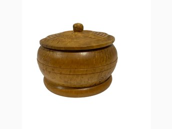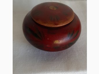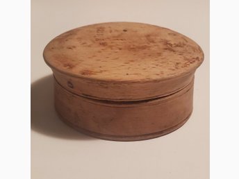 Liten handgjord allmogeburk i trä – rund med lock – ca 8 cm
