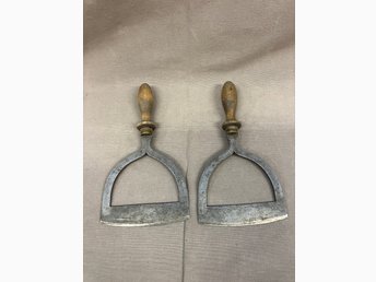 2 st kötthackor i järn med trähandtag, troligen 1800-tal, längd 28 cm
